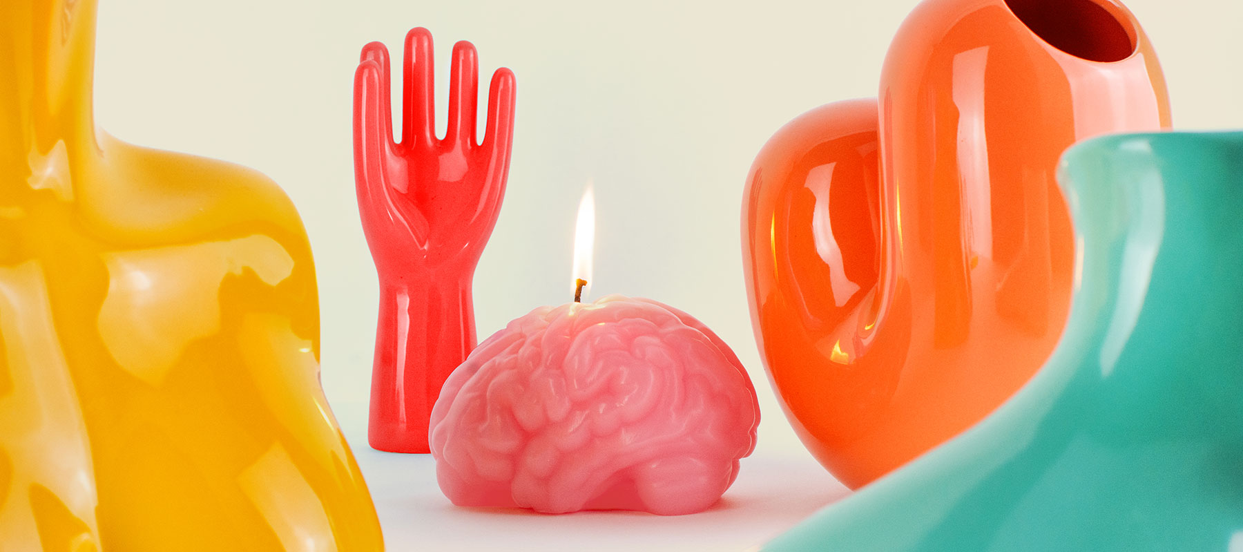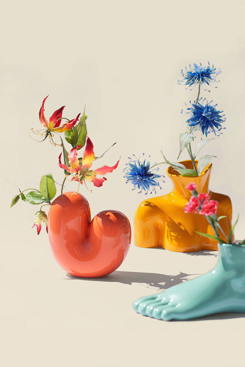 This collection definitely has a mind of its own — and a body to match! The colorful vases and jewelry holders are complemented by a candle shaped like a brain. Wondering which body part the orange vase is meant to represent? The *Sulcus Vase* is modeled after the very brain cell responsible for good ideas. The foot and torso vases also double as stylish bookends.